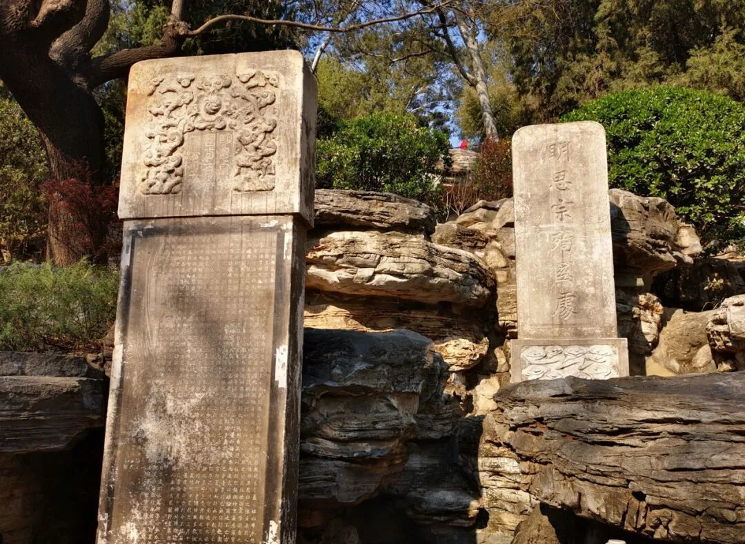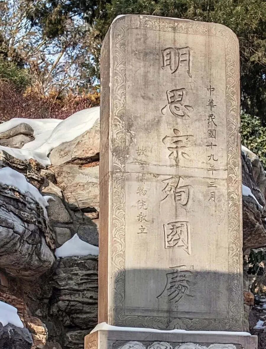 关于《明思宗殉国三百年纪念碑》有个小故事。1955年因碑文内容对李自成农民起义军不敬,该碑被拆除,改做公园的石桌。2003年景山公园职工在园内角落发现此碑,2004年修复后重新树立于原处。